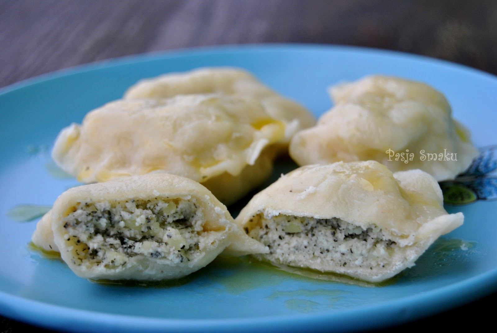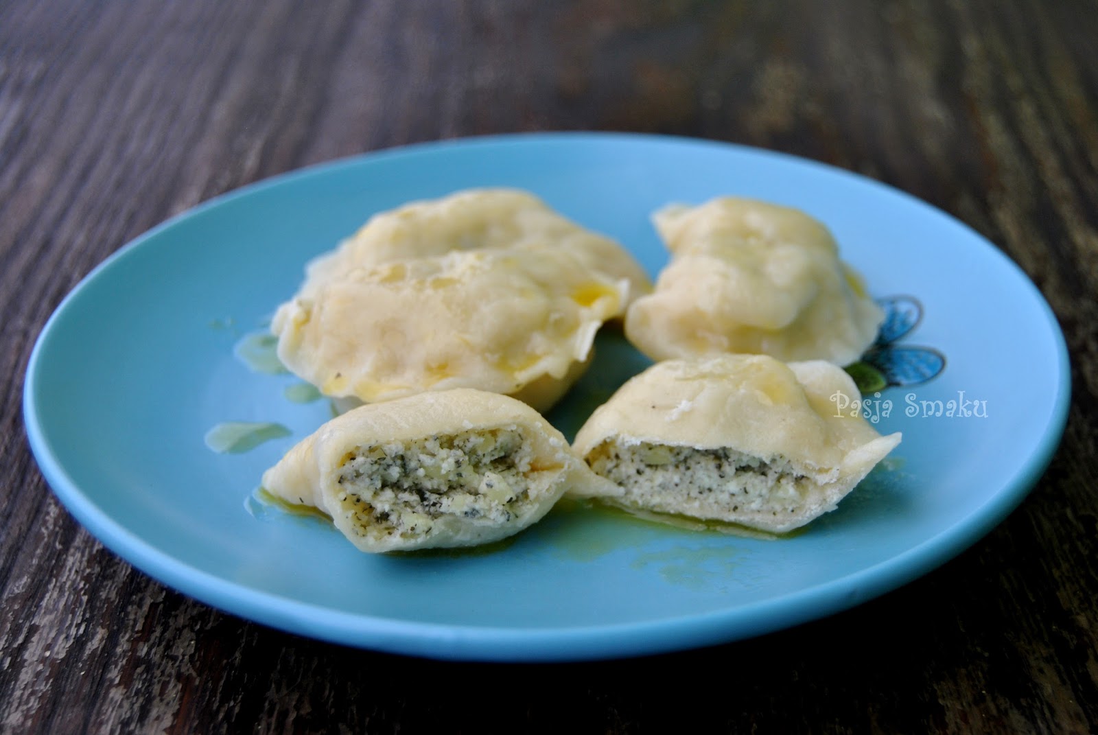Na krążki ciasta nakładać łyżeczką farsz i zlepić brzegi. Pierogi ugotować w osolonej wodzie. Wybierać łyżką cedzakową, gdy wypłyną na wierzch.