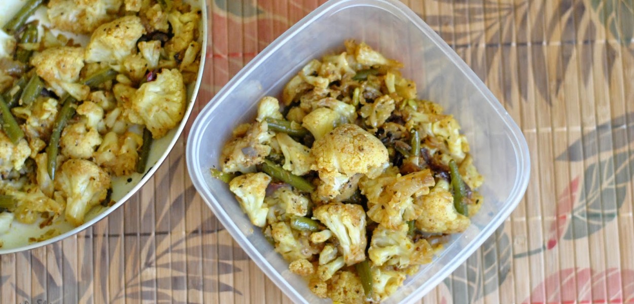 Na patelni rozgrzać olej, wrzucić pokrojoną w piórka cebulę, dodać przyprawy i chwilę podsmażać. Następnie dodać fasolkę i kalafiora. Warzywa wymieszać, obtoczyć przyprawami i podsmażać przez kilka minut.