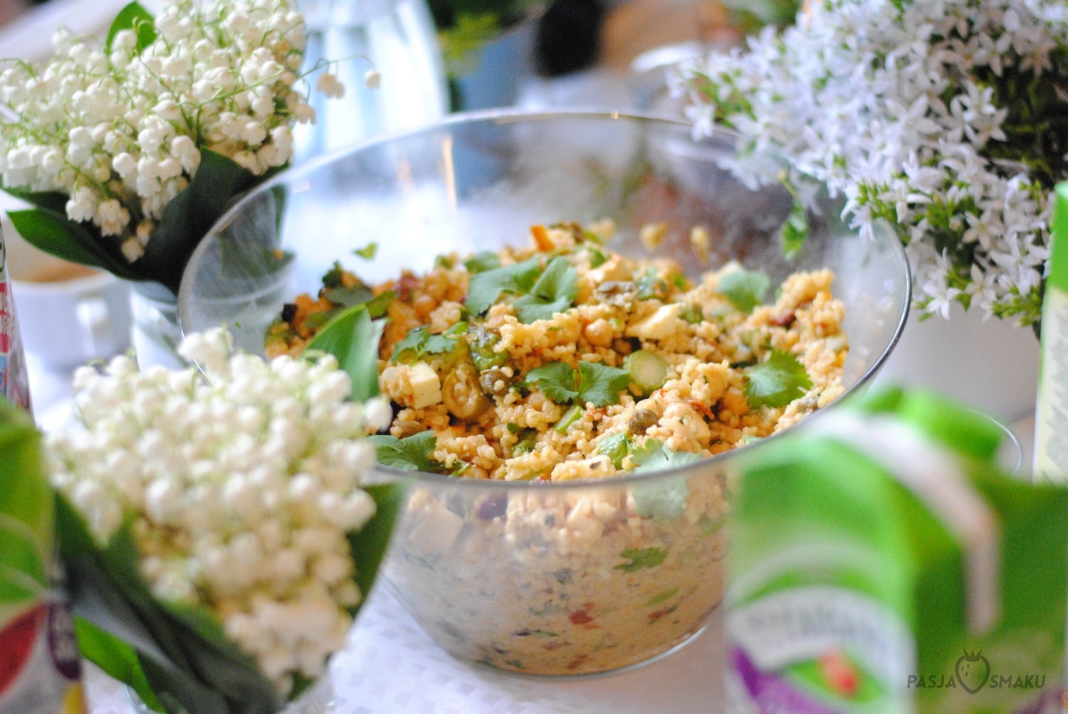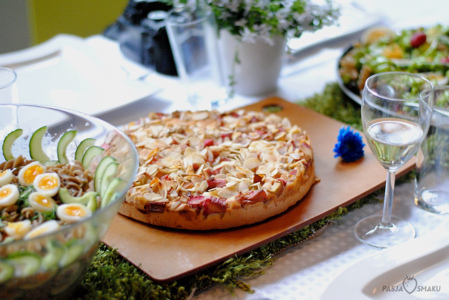 Po gotowaniu przyszedł czas na wspólny piknik przy „zielonej trawce” – swoją drogą dekoracja stołu była bardzo ładna i wiosenna. Przy kieliszku wina spróbowaliśmy każdej z potraw, a na koniec zjedliśmy podwójny deser.