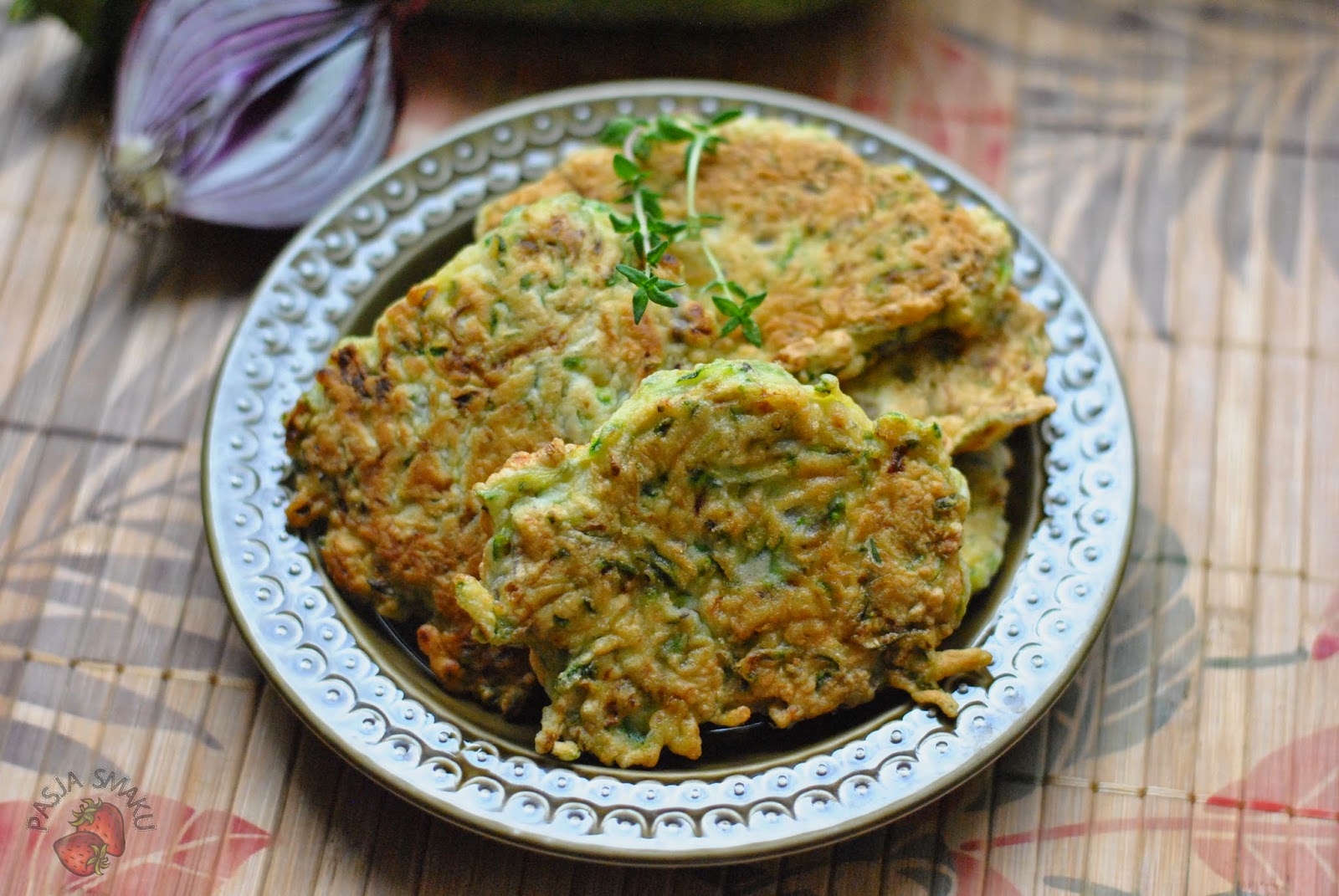 Czerwoną cebulę pokroić w kostkę, a tymianek posiekać i dodać do cukinii. Wbić jajka wymieszać, doprawić do smaku i dodawać powoli mąkę. Ciasto powinno być gęste, ale nie może się rozlewać po patelni. Jeśli będzie za gęste można dodać jogurtu lub mleka.