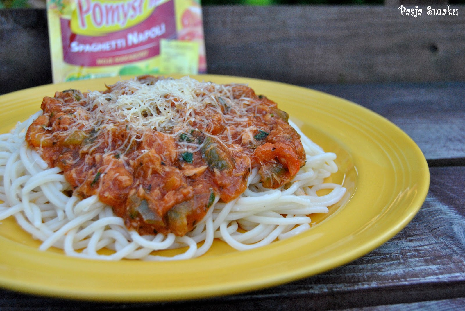 Kiedyś sosy z torebki często pojawiały się w mojej kuchni. Sama nie wiem dlaczego: może z wygody, niewiary we własne umiejętności, może chcieliśmy tak oszczędzić czas… Teraz wiem, że lepiej jest przygotować sos do spaghetti samemu, bo wtedy jest najlepszy. Jednak zdecydowałam się wypróbować „Pomysł na… Spaghetti Napoli” i wykorzystać przepis z opakowania. Przyznam, że wyszło całkiem niezłe, nie wyczuwało się tej całej „torebkowości”, która często towarzyszy innym podobnym sosom.