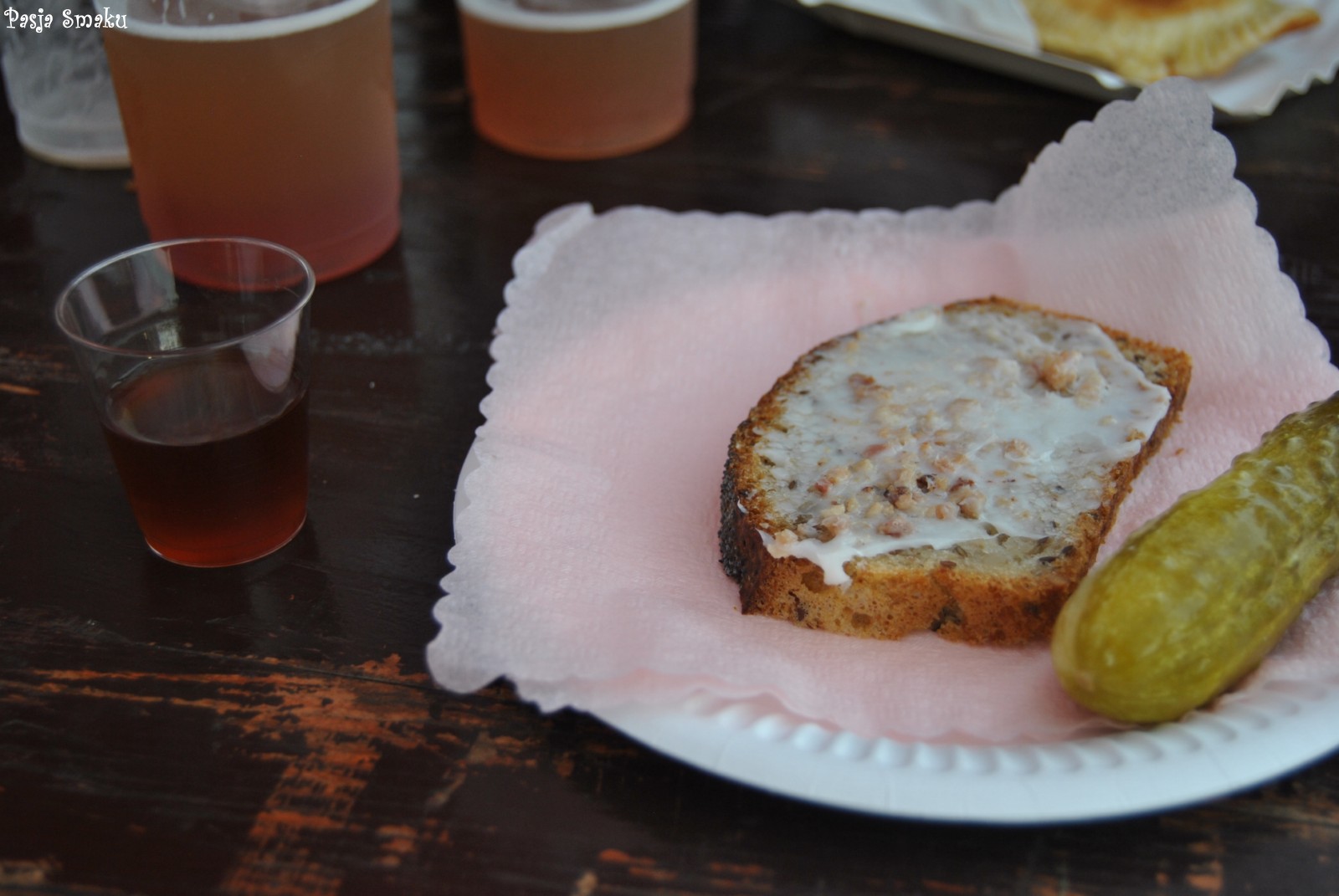 Pyszna nalewka i tradycyjny chleb ze smalcem i ogórkiem.