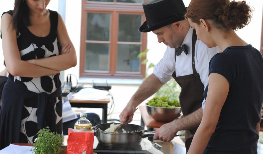 Warsztaty poprowadził Kamil Kotarski, który przygotował dla nas ciekawą prezentację o kuchni przedwojennego Lublina oraz cztery przepisy, które miały nas przenieść smakiem do dawnych lat. W oczekiwaniu na przygotowanie stanowisk można było poczuć się jak na pikniku: nie zabrakło leżaków, koców i smacznego jedzenia (cebularze, owoce, ciasteczka, oliwki, sery i konfitury) oraz posłuchać największych szlagierów z tego okresu.
