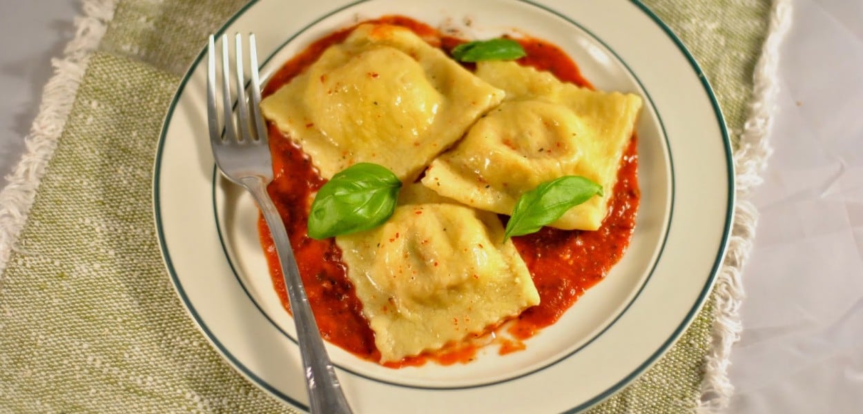 Ravioli podawać z sosem pomidorowym i świeżymi listkami bazylii.