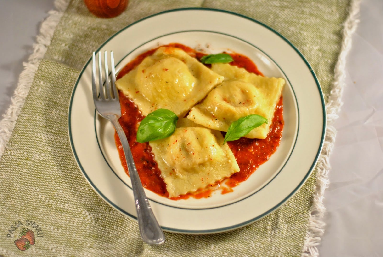 Ravioli podawać z sosem pomidorowym i świeżymi listkami bazylii.