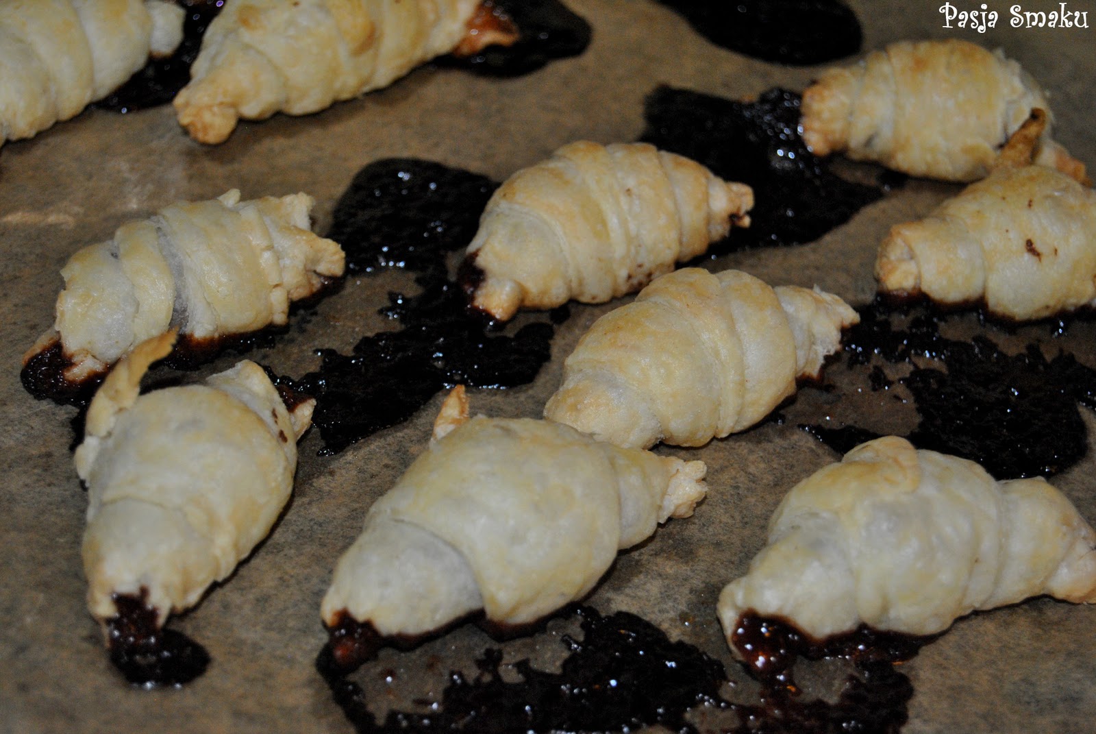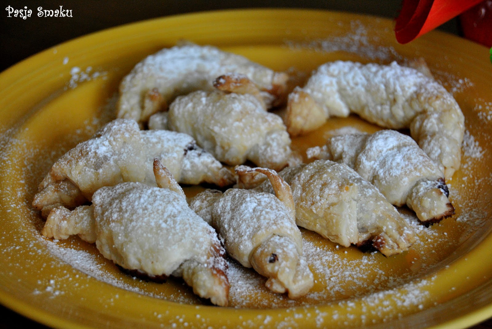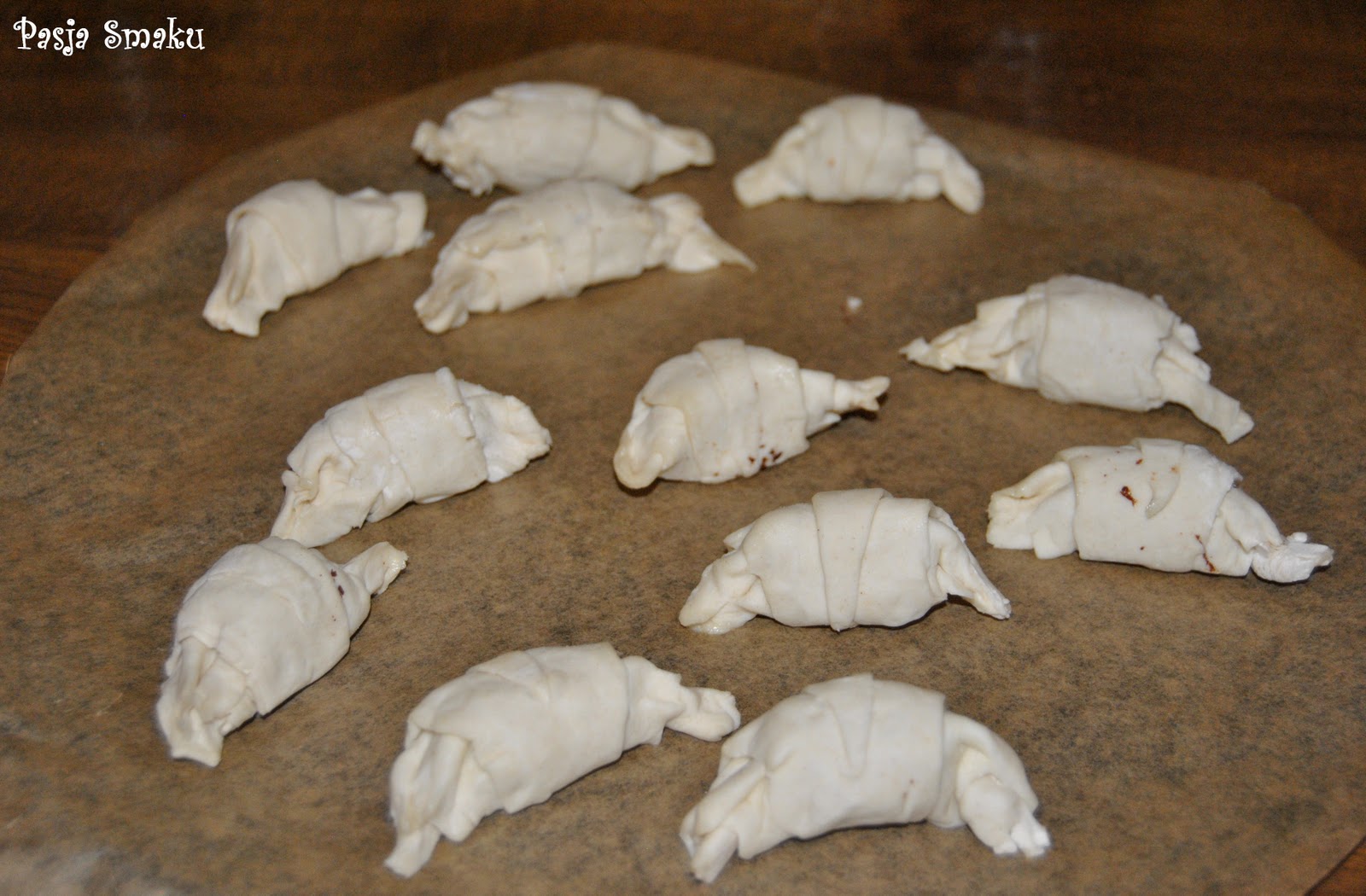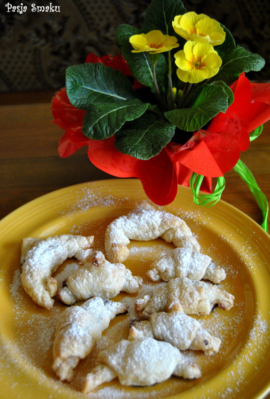 Moje pierwsze rogaliki z ciasta francuskiego. Oczywiście nie są idealne, ale pierwsze razy zazwyczaj nie są. Pomysł zapożyczyłam od koleżanki. Kiedyś ugościła nas – niespodziewanych gości takimi rogalikami do herbaty.