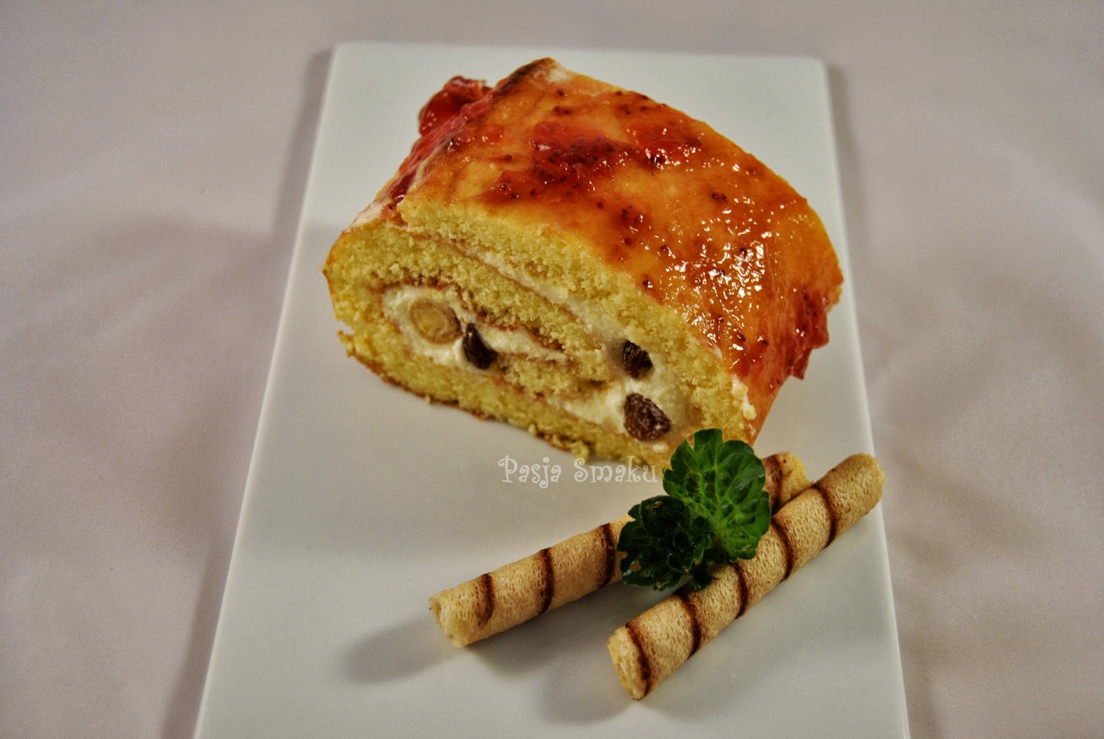 Roladę zwinąć i odstawić do lodówki. Po zastygnięciu masy wyjąć roladę i posmarować dżemem lub konfiturą.