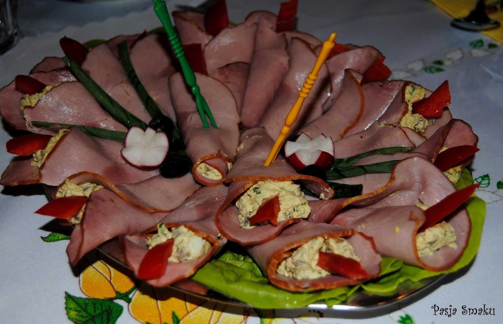 4. Gotową masą faszerować zrolowane plasterki szynki.