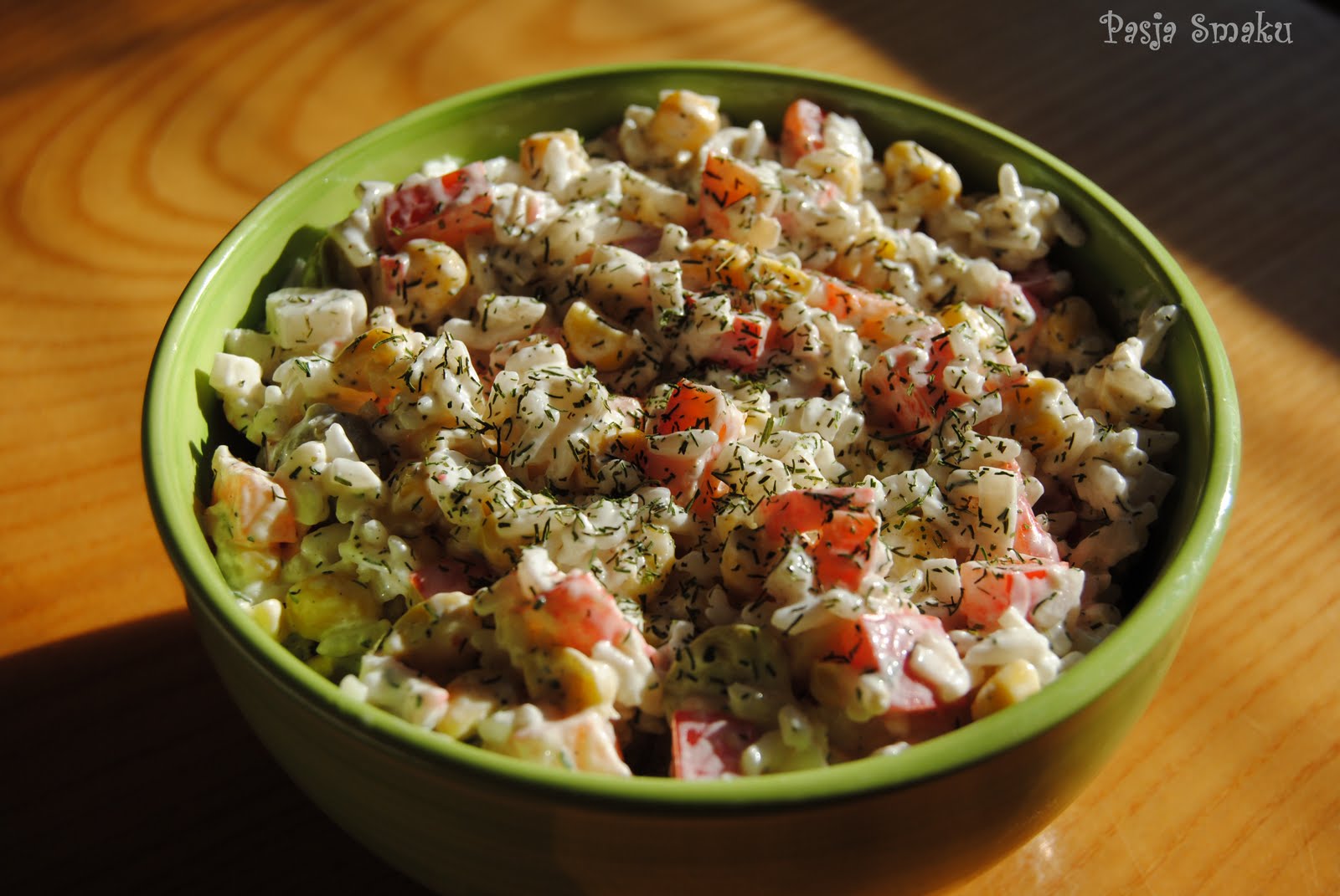 3. W do miski z zimnym ryżem dodajemy paprykę, oliwki, surimi i kukurydzę. Mieszamy z majonezem i jogurtem naturalnym.