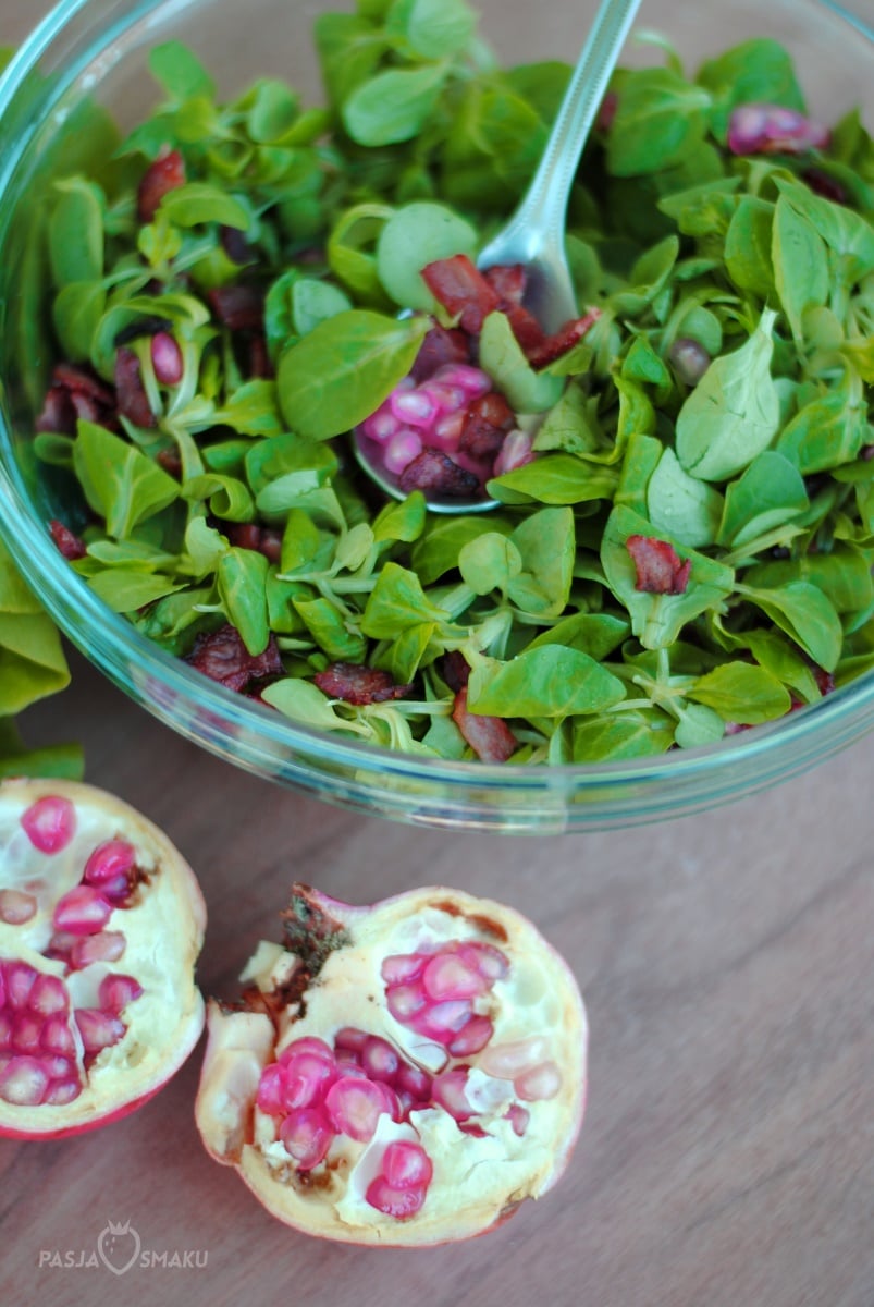 Roszponkę przełożyć do miski, granaty obrać, ziarenkami granatu posypać roszponkę. Boczek pokroić w dużą kostkę i podsmażyć na patelni. Odstawić do ostudzenia i odsączyć z nadmiaru tłuszczu. Roszponkę posypać boczkiem.