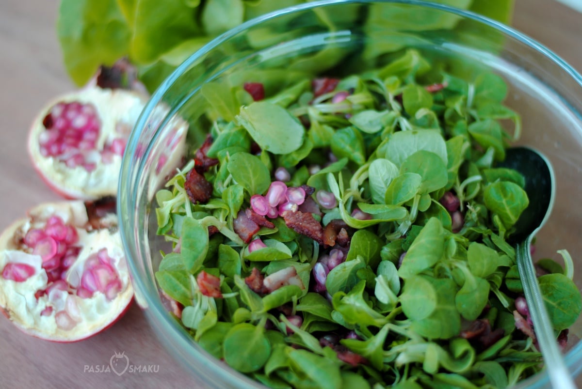 Przepis na tę sałatkę siostra dostała od koleżanki. Przygotowuje się ją bardzo szybko i wystarczy tylko kilka składników, by przygotować ją na przyjazd niespodziewanych gości. Lekka i świeża sałatka z roszponką i granatem doskonale komponuje się z sosem miodowo-musztardowym.