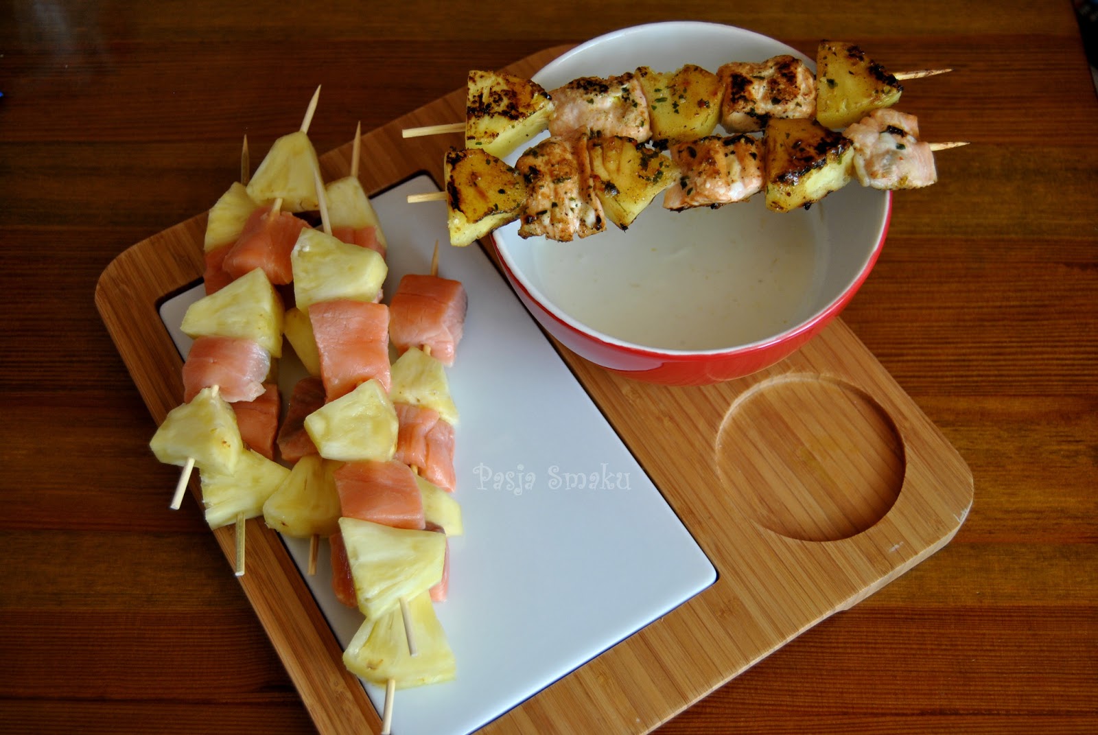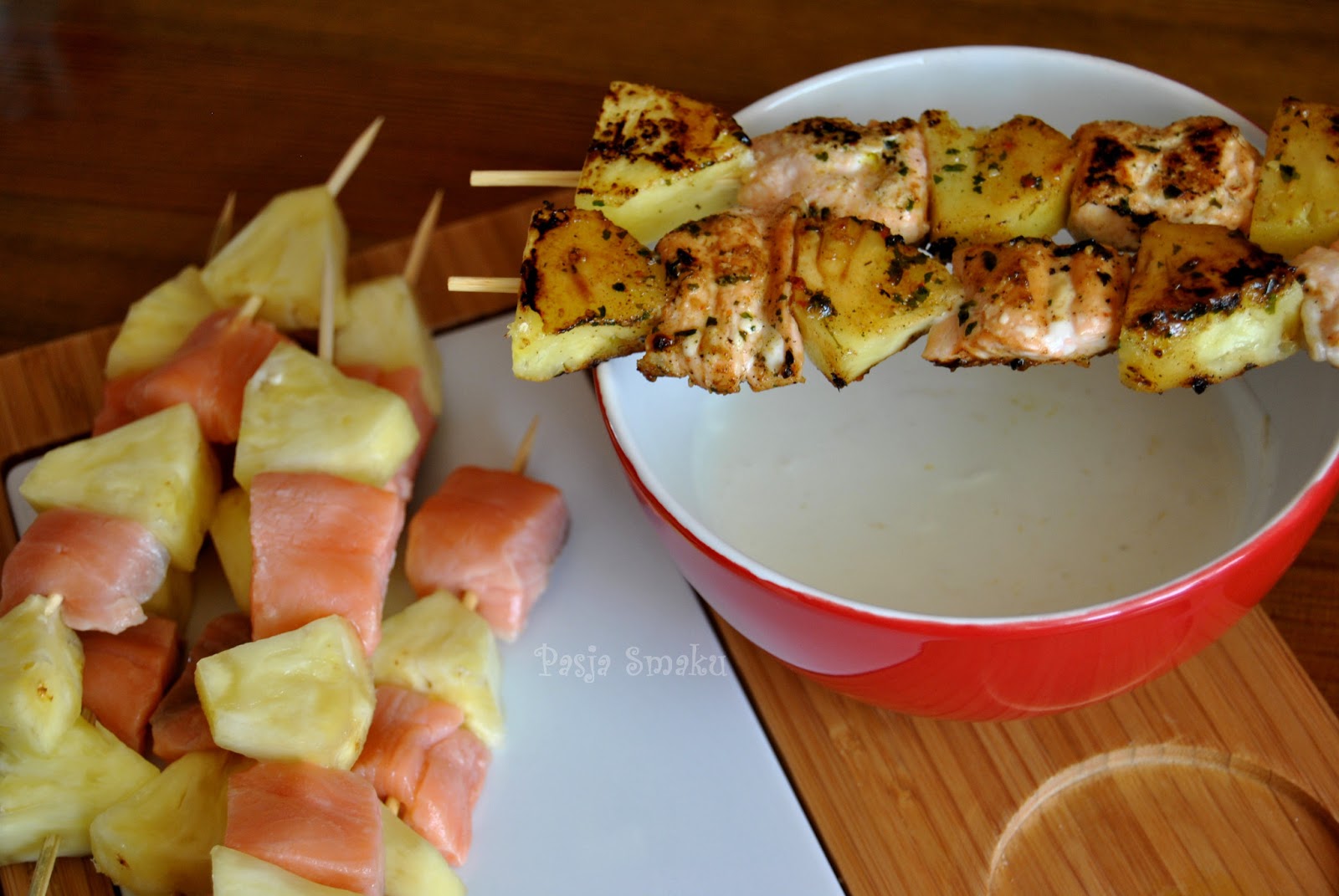 Bardzo lubię łososia i wciąż tęsknię za latem, dlatego znów przygotowałam szaszłyki z dodatkiem cytrynowej śmietany. Lekkie i ciekawe połączenie ryby z ananasem.