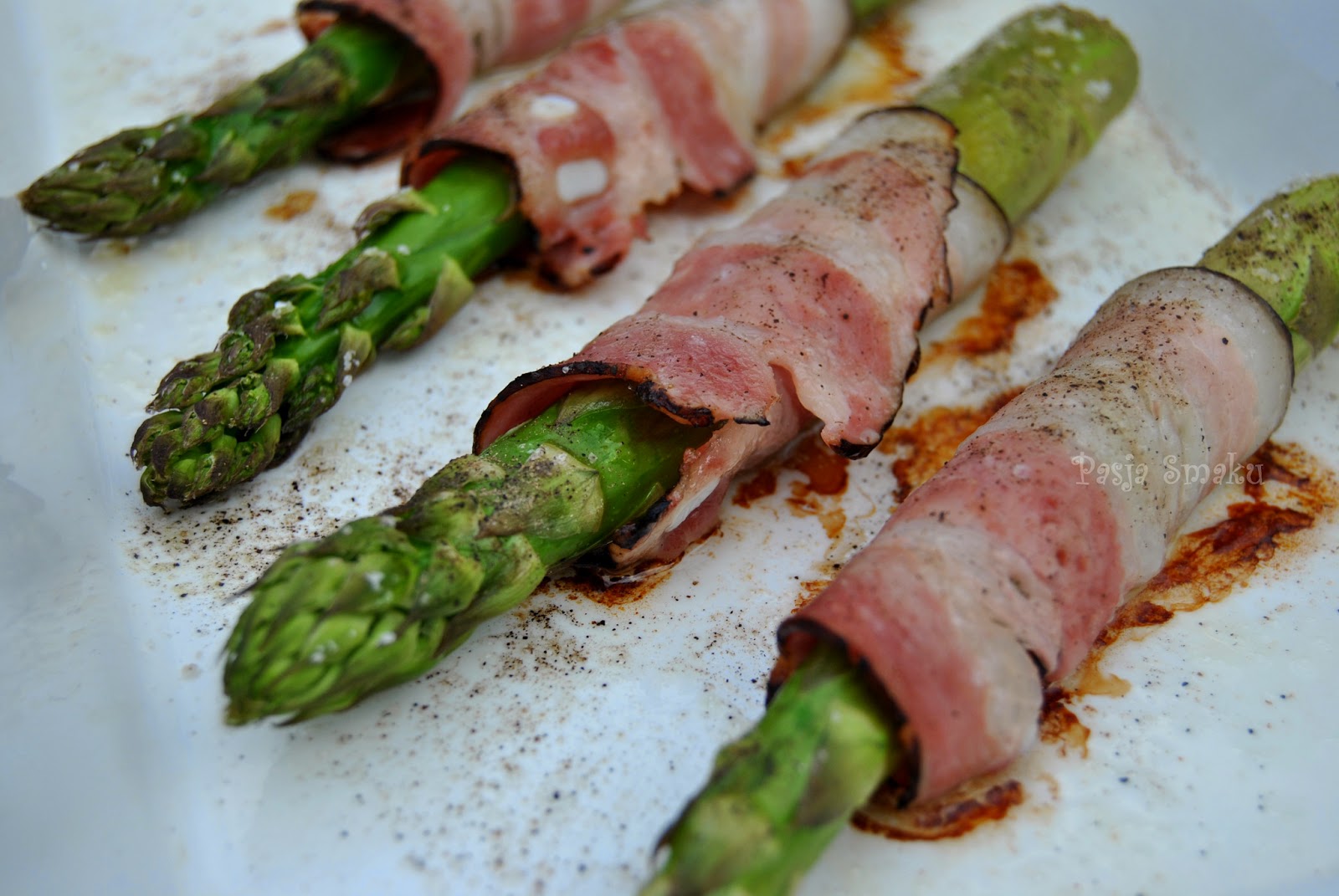 Ze szparagów usunąć zdrewniałe końcówki, umyć i osuszyć. Każdego szparaga owinąć plastrem boczku i ułożyć w naczyniu do zapiekania.