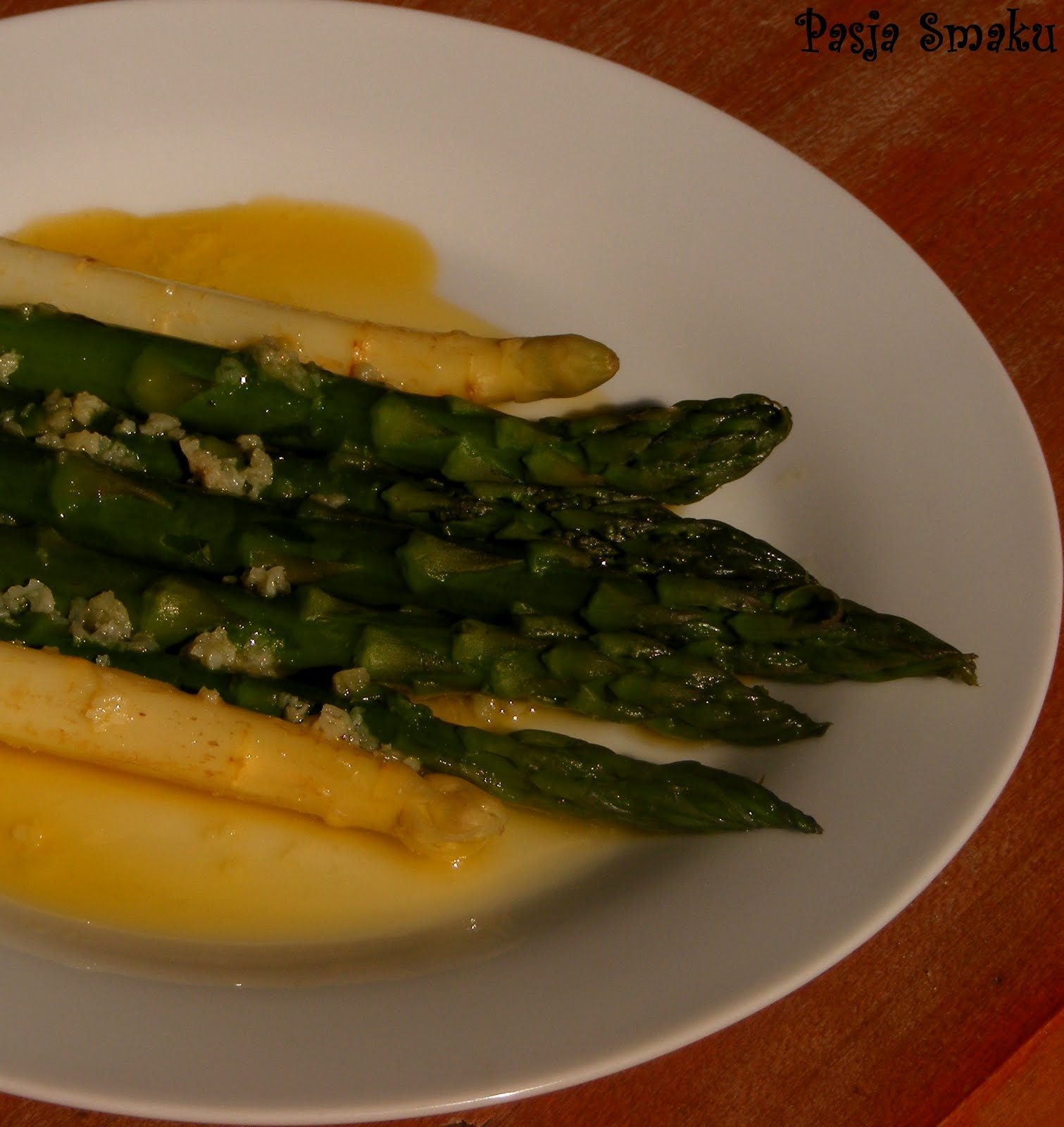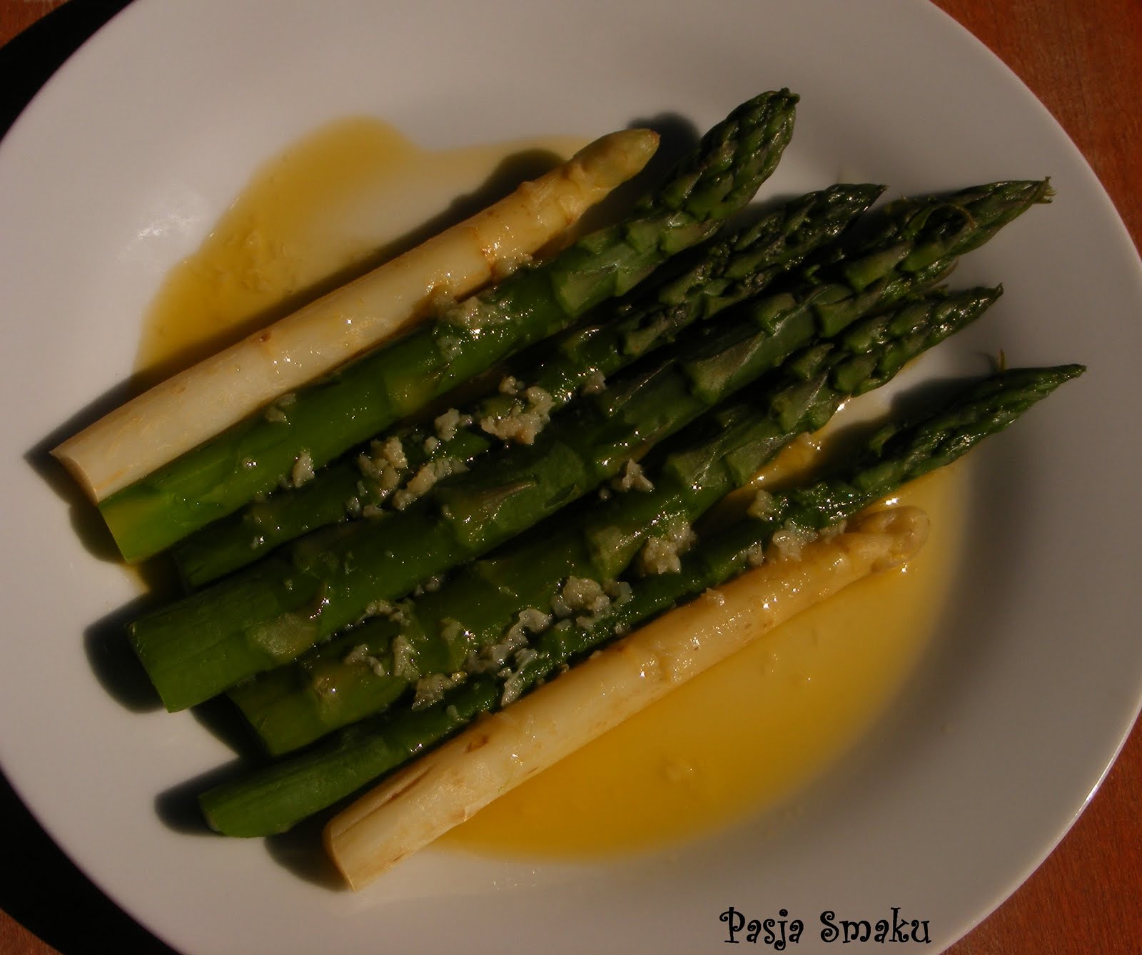 pęczek zielonych szparagówpół pęczka białych szparagów3 łyżki masła2 ząbki czosnkuszczypta soliłyżka soku z cytryny