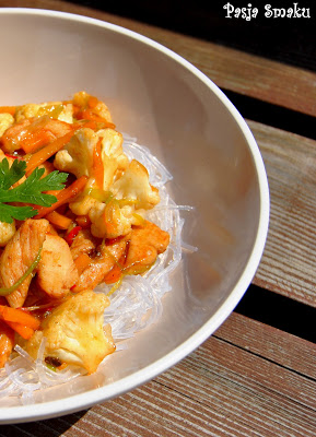 Przepis na makaron (trochę przeze mnie zmieniony) pochodzi z recenzowanej przeze mnie wcześniej na blogu książki „Łatwe makarony”. Zapraszam na trochę słońca. Źródło: Łatwe makarony, Warszawa 2012, 96 s. Składniki: pierś z kurczaka 1/2 łyżeczki chili 3 łyżki sosu sojowego