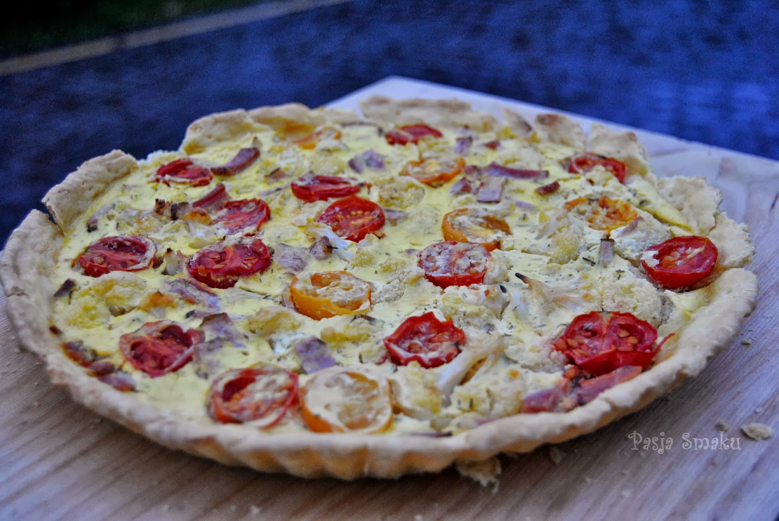 Uwielbiam tarty, robię je co jakiś czas, często ze składników, które akurat mam w lodówce lub pod ręką. Tym razem padło na kalafior. Dodałam jeszcze pomidorki koktajlowe i szynkę. Najbardziej tartach lubię to, że są dobre zarówno na ciepło, jak i na zimno.