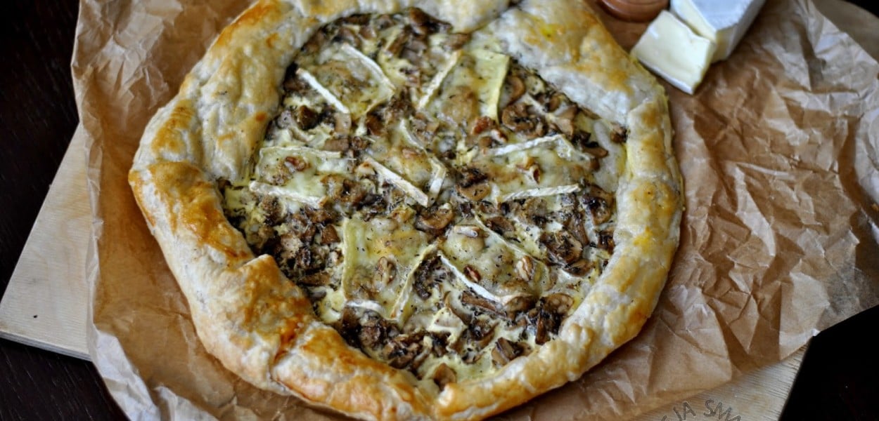 Na blaszce wyłożonej papierem do pieczenia położyć ciasto francuskie. Na środku, w odległości ok. 4-5 cm od brzegów rozłożyć równomiernie farsz i zawinąć brzegi ciasta tak, by powstała okrągła tarta. Następnie wymieszać mleko, jajko i śmietanę – doprawić solą i pieprzem – i ostrożnie polać farsz masą jajeczną. Na wierzchu ułożyć plastry sera camembert i posypać posiekanymi orzechami włoskimi.