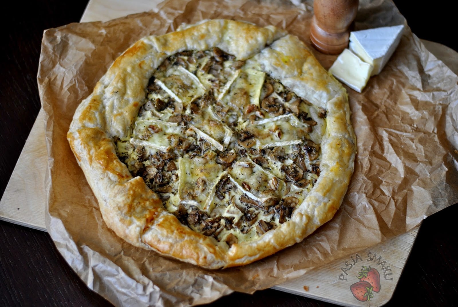 Na blaszce wyłożonej papierem do pieczenia położyć ciasto francuskie. Na środku, w odległości ok. 4-5 cm od brzegów rozłożyć równomiernie farsz i zawinąć brzegi ciasta tak, by powstała okrągła tarta. Następnie wymieszać mleko, jajko i śmietanę – doprawić solą i pieprzem – i ostrożnie polać farsz masą jajeczną. Na wierzchu ułożyć plastry sera camembert i posypać posiekanymi orzechami włoskimi.