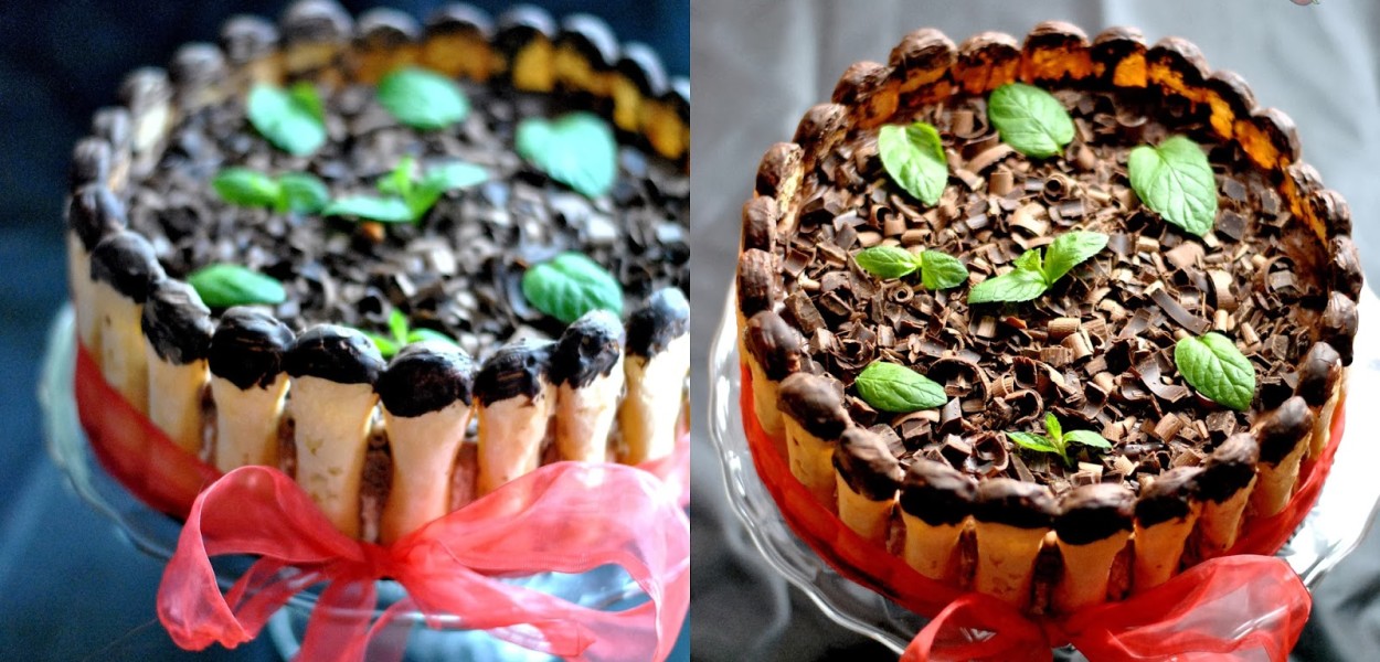Spód i boki tortownicy wyłożyć podłużnymi biszkoptami. Moja rada: te przy bokach lepiej przekroić na pół, bo inaczej będą bardzo wystawały poza tort. Nałożyć masę serową i wstawić do lodówki w celu schłodzenia. Na stężony serek wyłożyć mus czekoladowy. I znów wstawić do lodówki na min. 2-3 godziny, a najlepiej na całą noc.