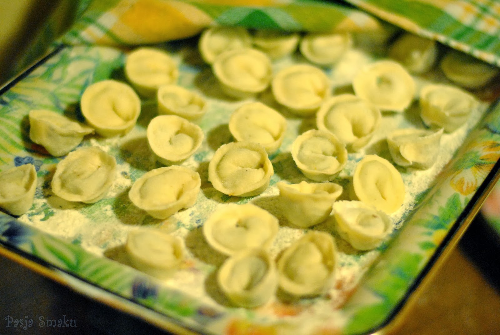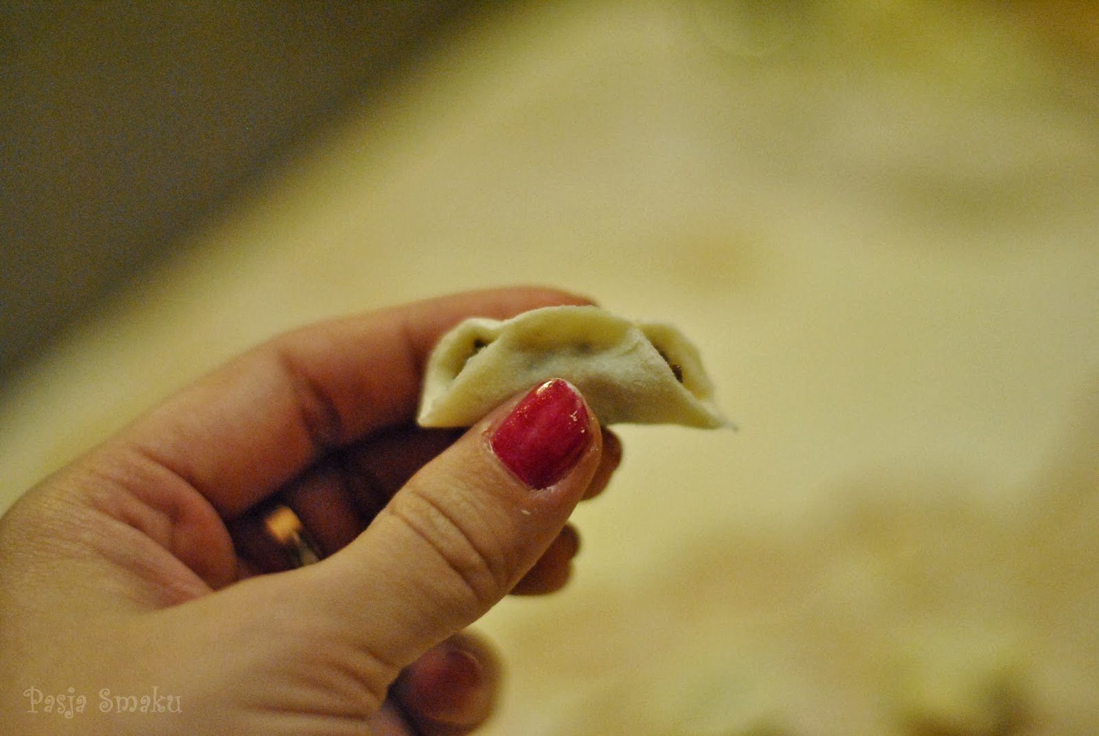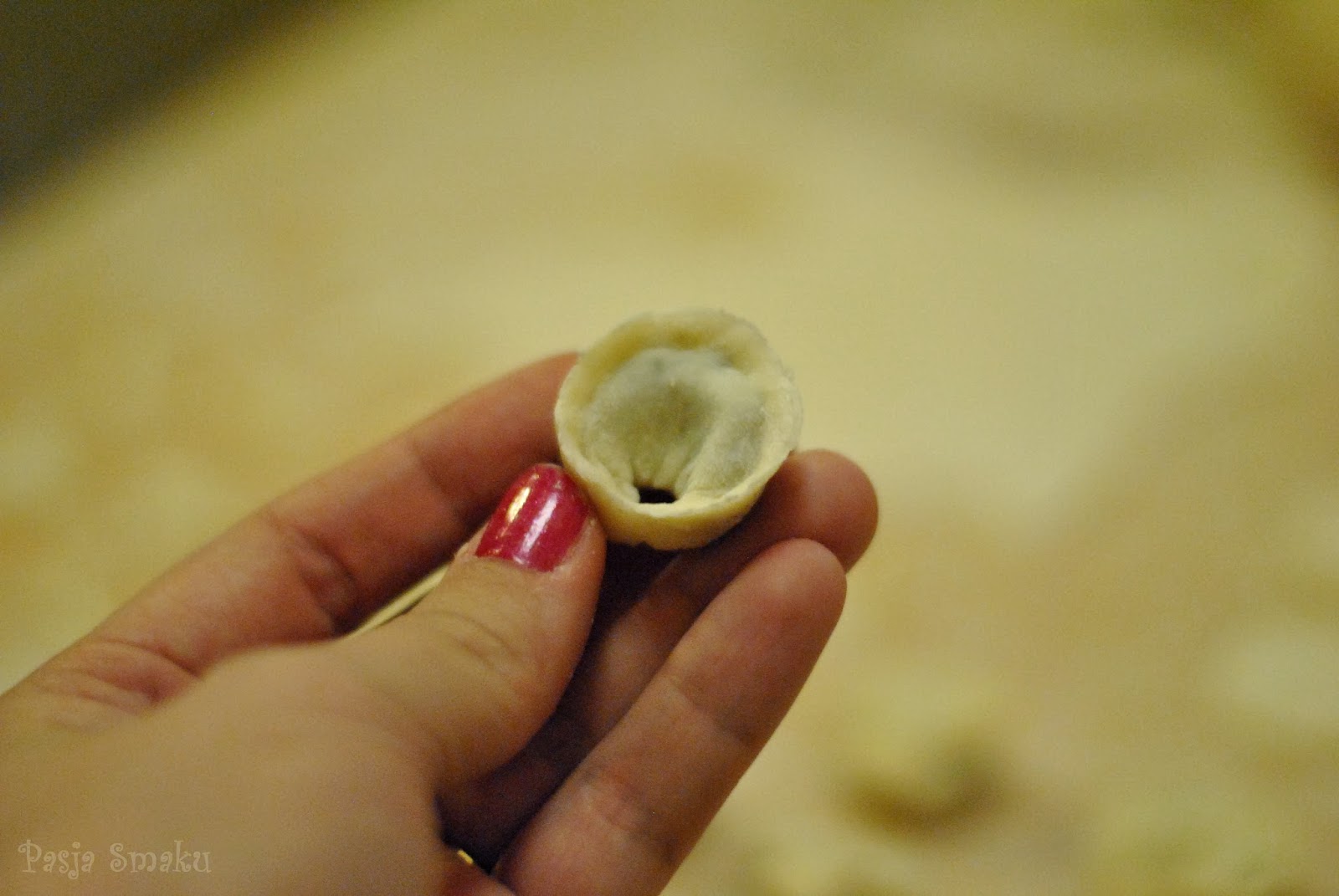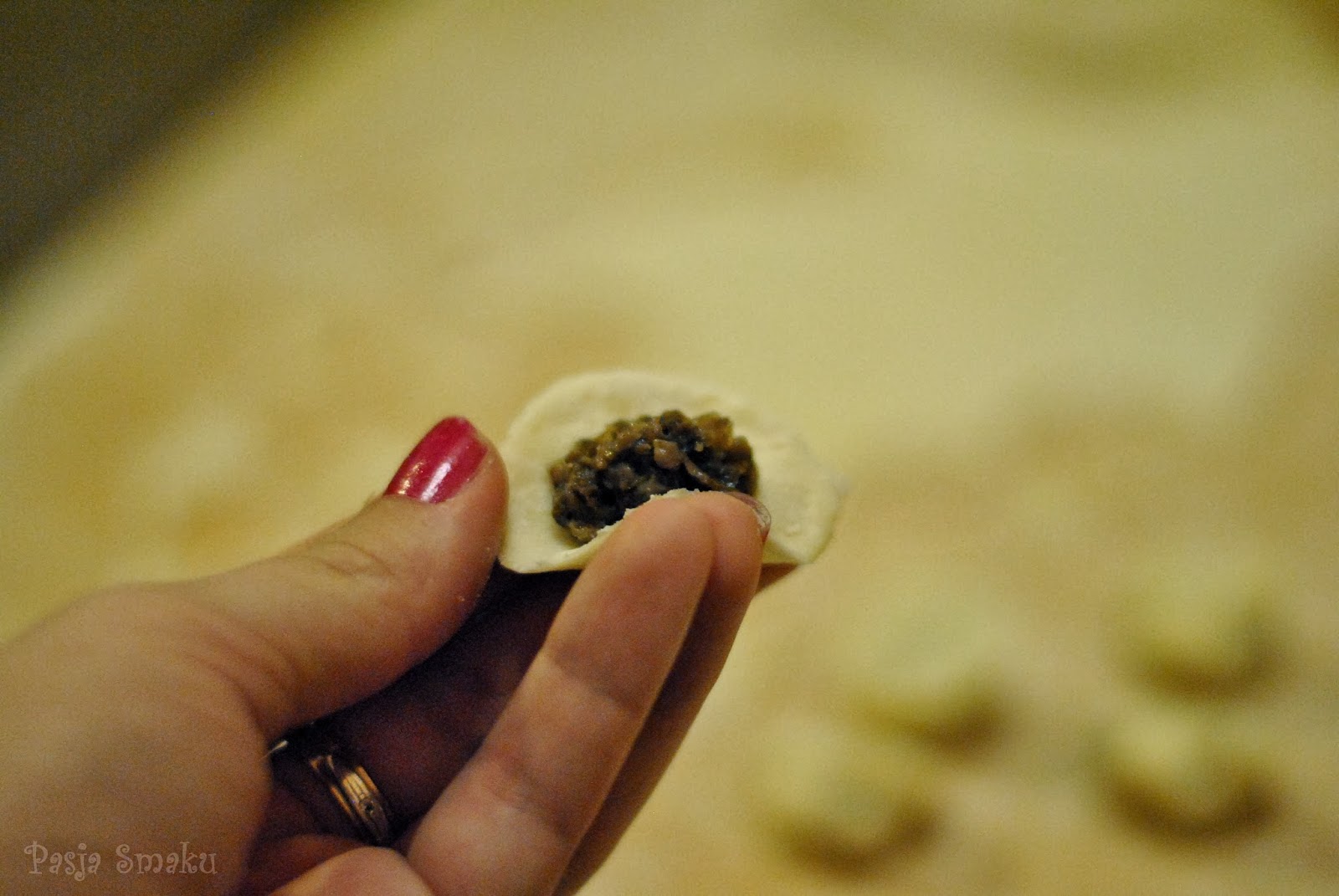 Z ciasta odcinak kawałki i cienko je rozwałkowywać. Za pomocą kieliszka wycinać kółka i nakładać na nie niewielkie ilości farszu. Brzegi uszek zlepiać, jak w przypadku pierogów, a ich rożki sklejać razem.