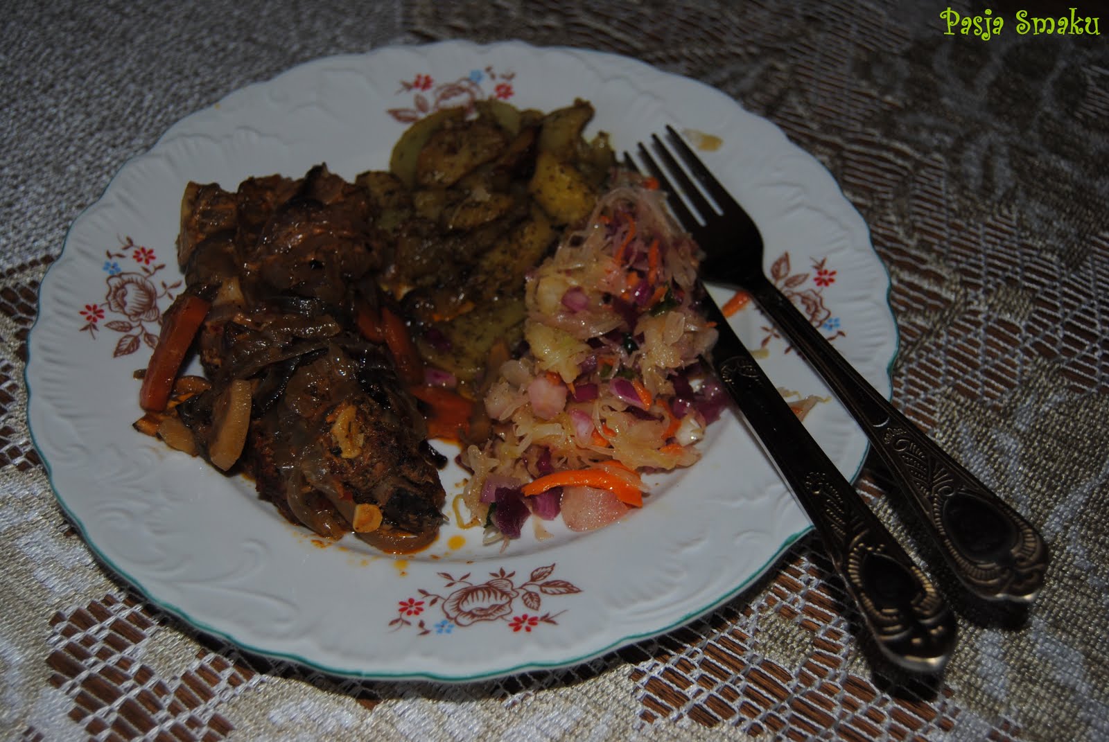 Żeberka podałam z pieczonymi w piekarniku ziemniakami i surówką z kiszonej kapusty.